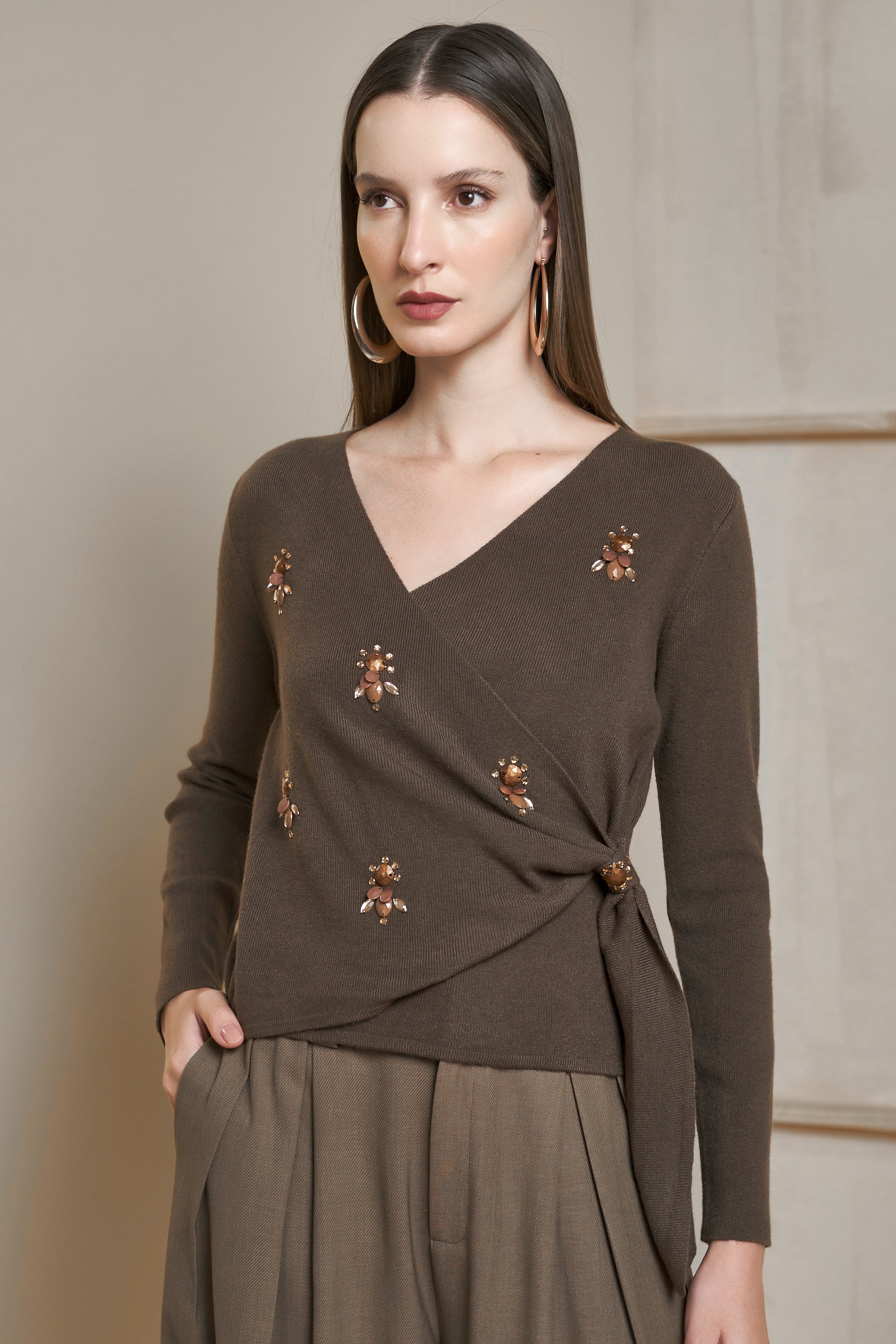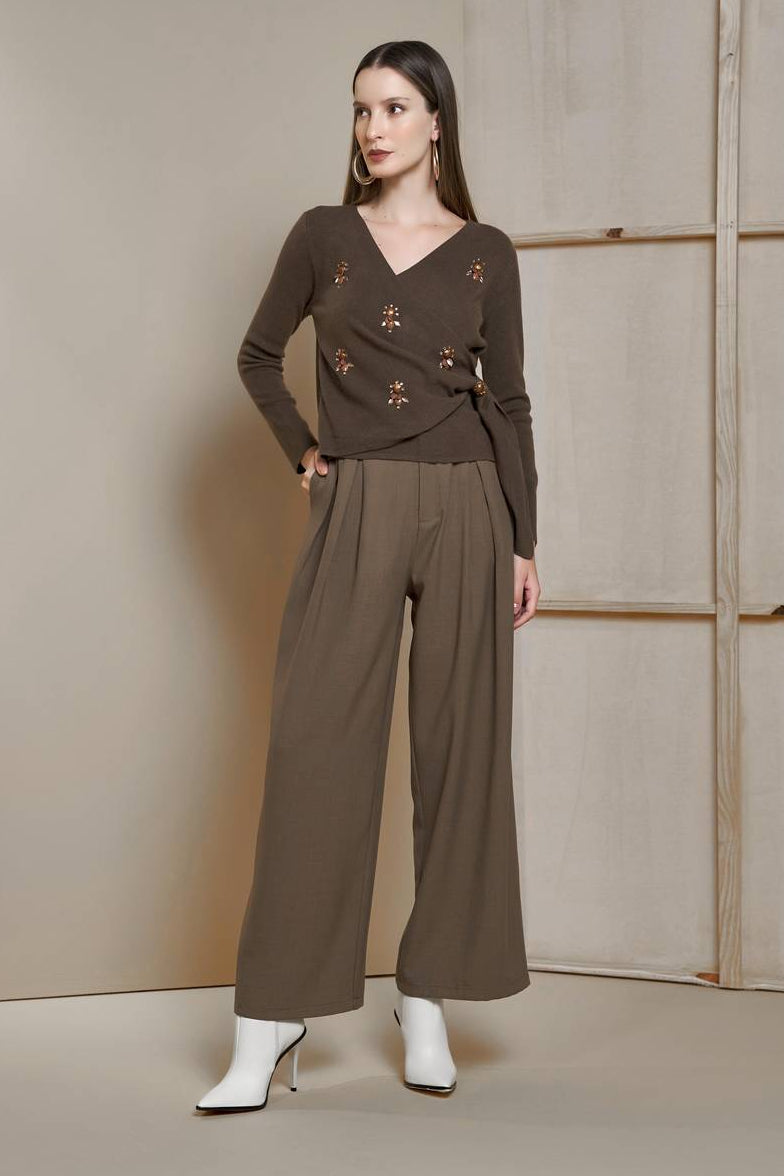 Blusa confeccionada em tricot. Essa peça possui mangas longas, decote em V transpassado com amarração lateral, lindo bordado manual em chatom.  Ideal para eventos casuais e informais.