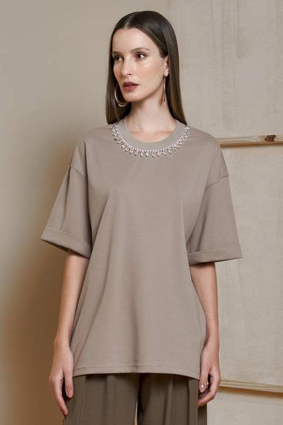 Blusa feminina em algodão com modelagem levemente oversized e caimento solto, que une conforto e sofisticação. Possui decote redondo, mangas 3/4 e bordado manual em miçanga, agregando um toque delicado ao visual. Versátil, é ideal para eventos casuais e informais, compondo produções elegantes para o dia ou noite.