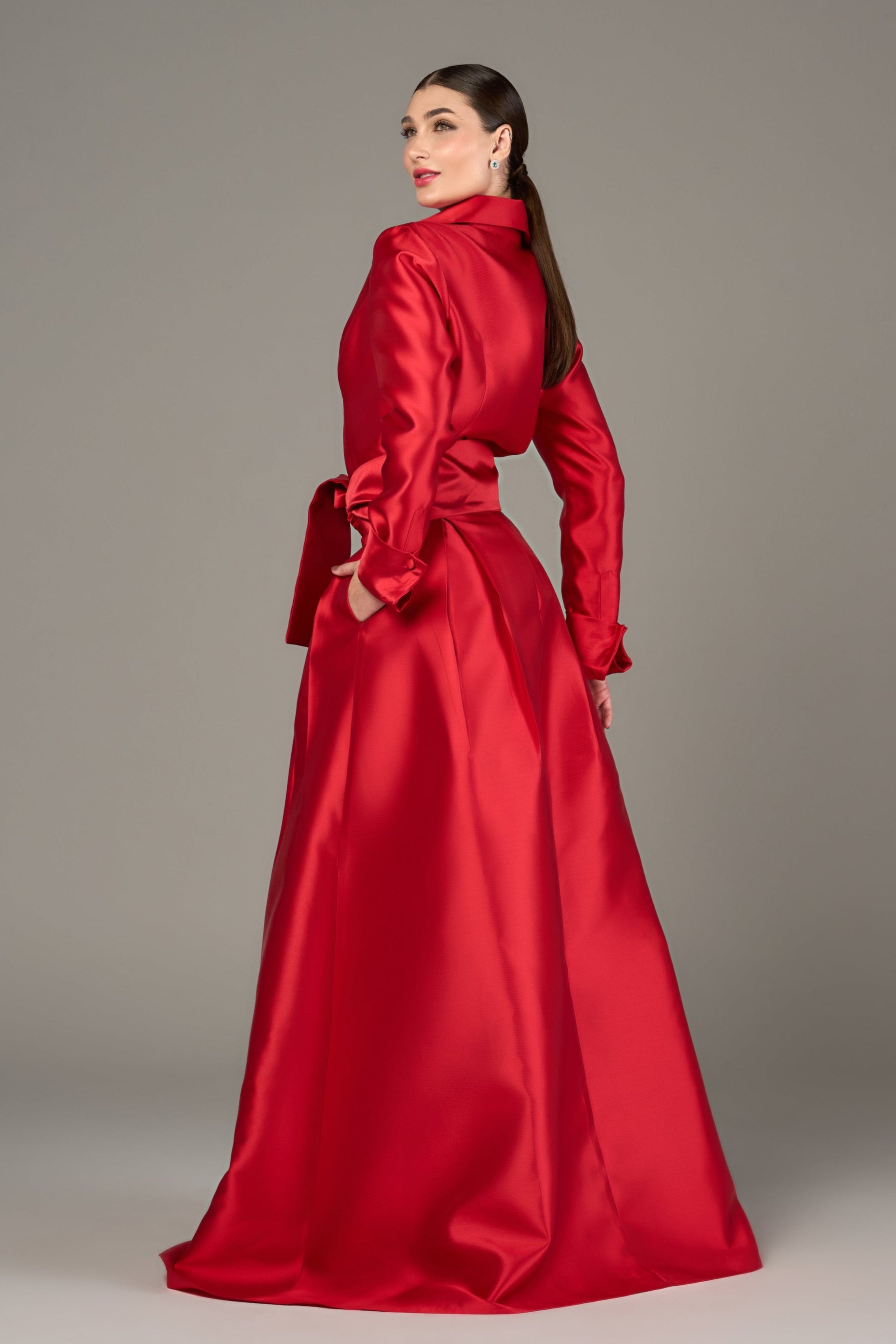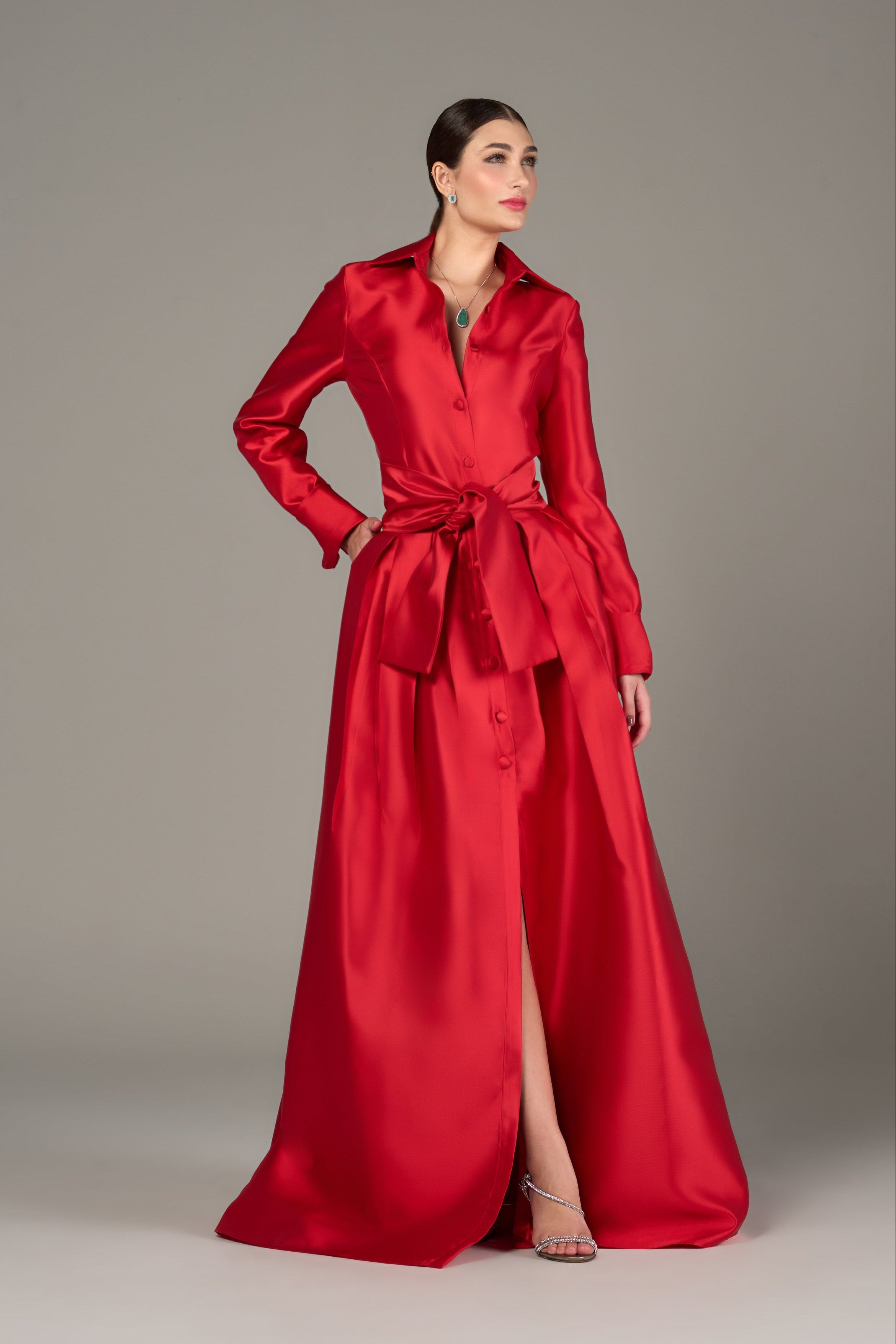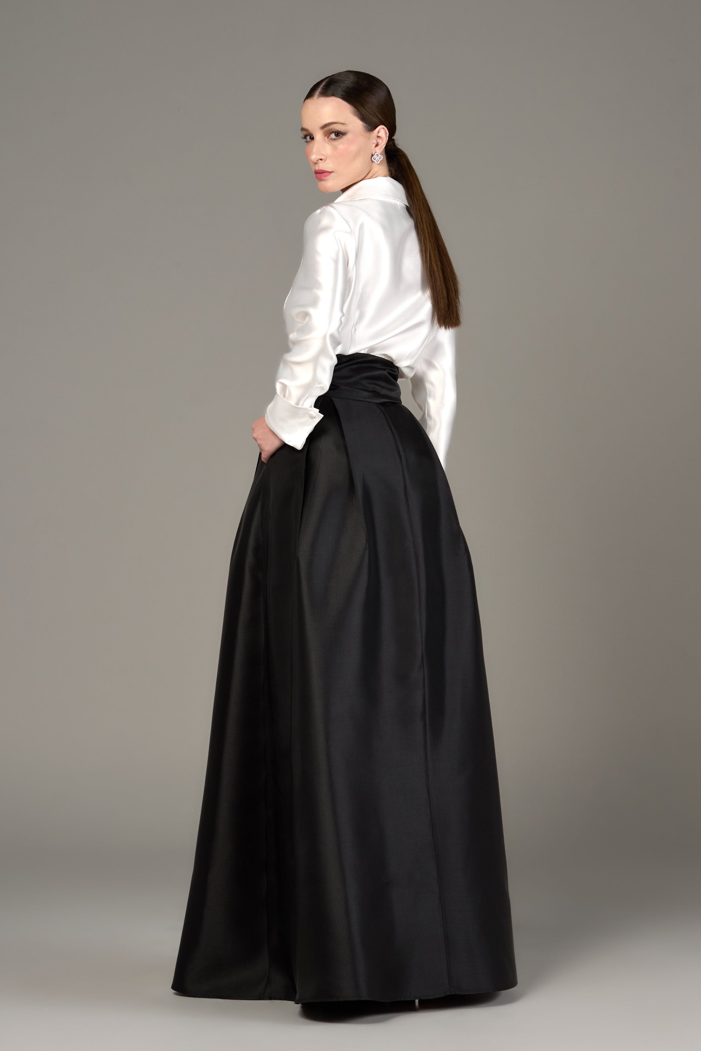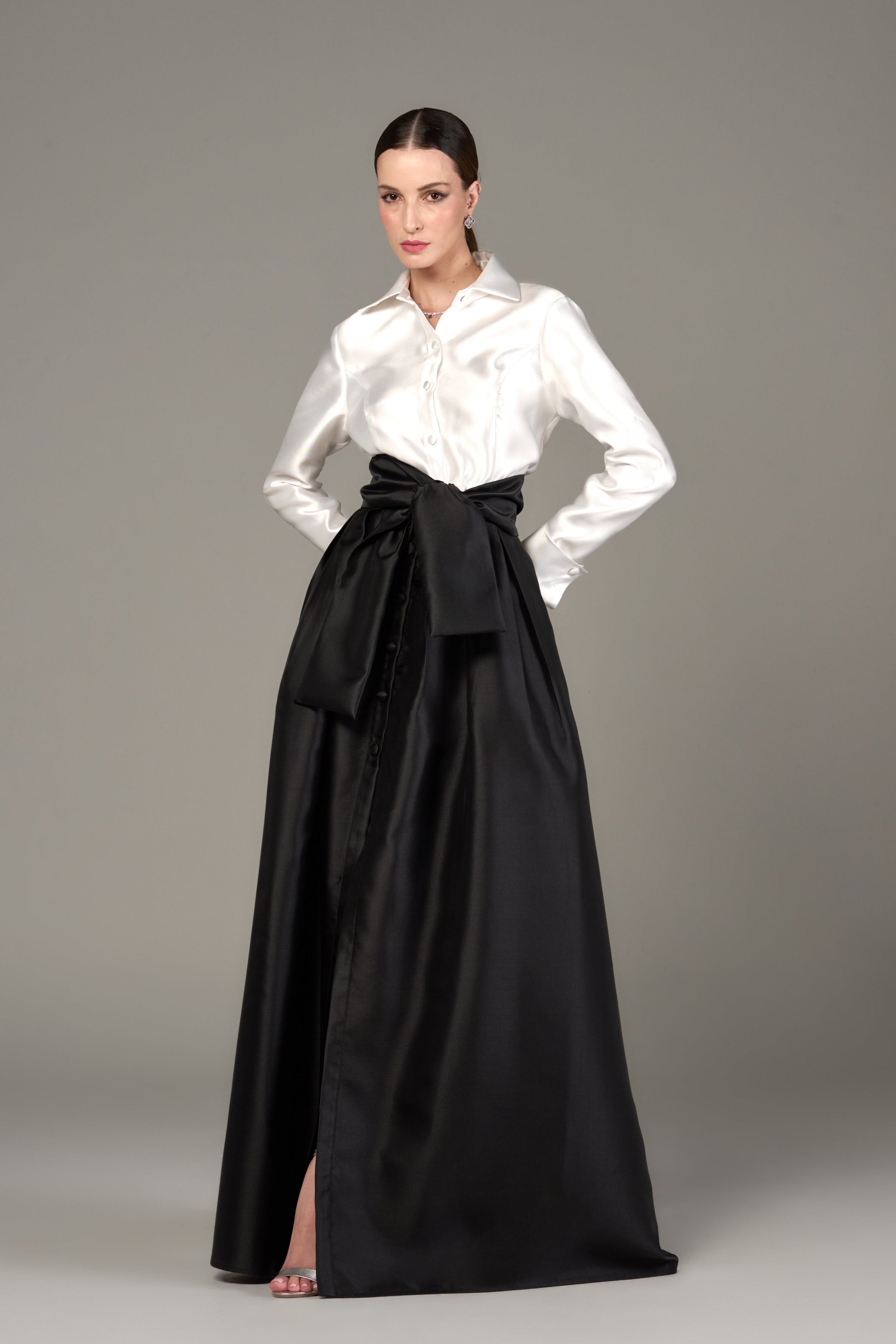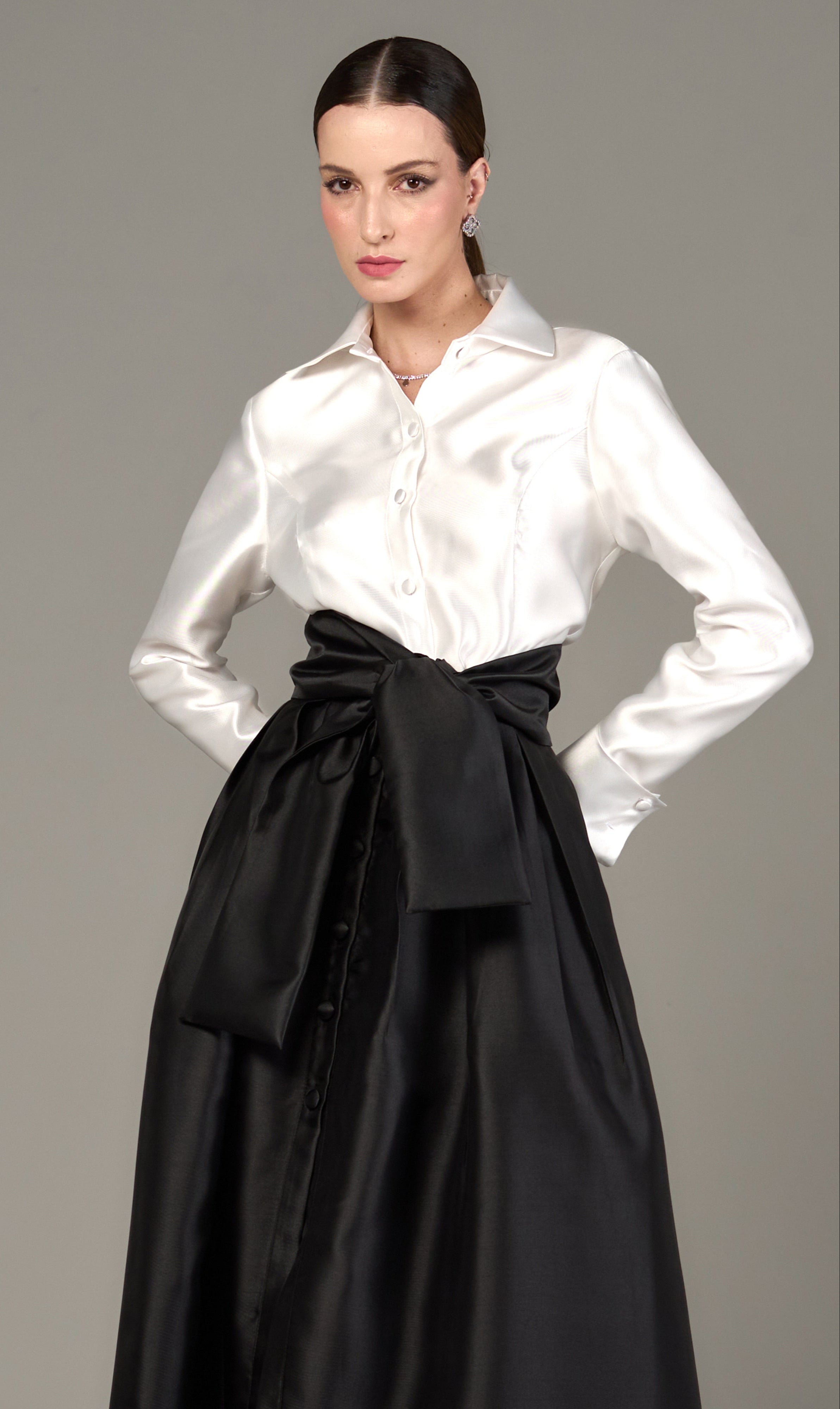 Conjunto feminino elegante em zibeline silky, composto por camisa de mangas longas com botões frontais forrados e saia longa com pregas, botões frontais e zíper invisível nas costas. Acompanha faixa para amarração que valoriza a silhueta e permite diferentes formas de uso. Com caimento estruturado e sofisticado, é ideal para eventos formais, ocasiões sociais, jantares, celebrações e produções refinadas do dia à noite.