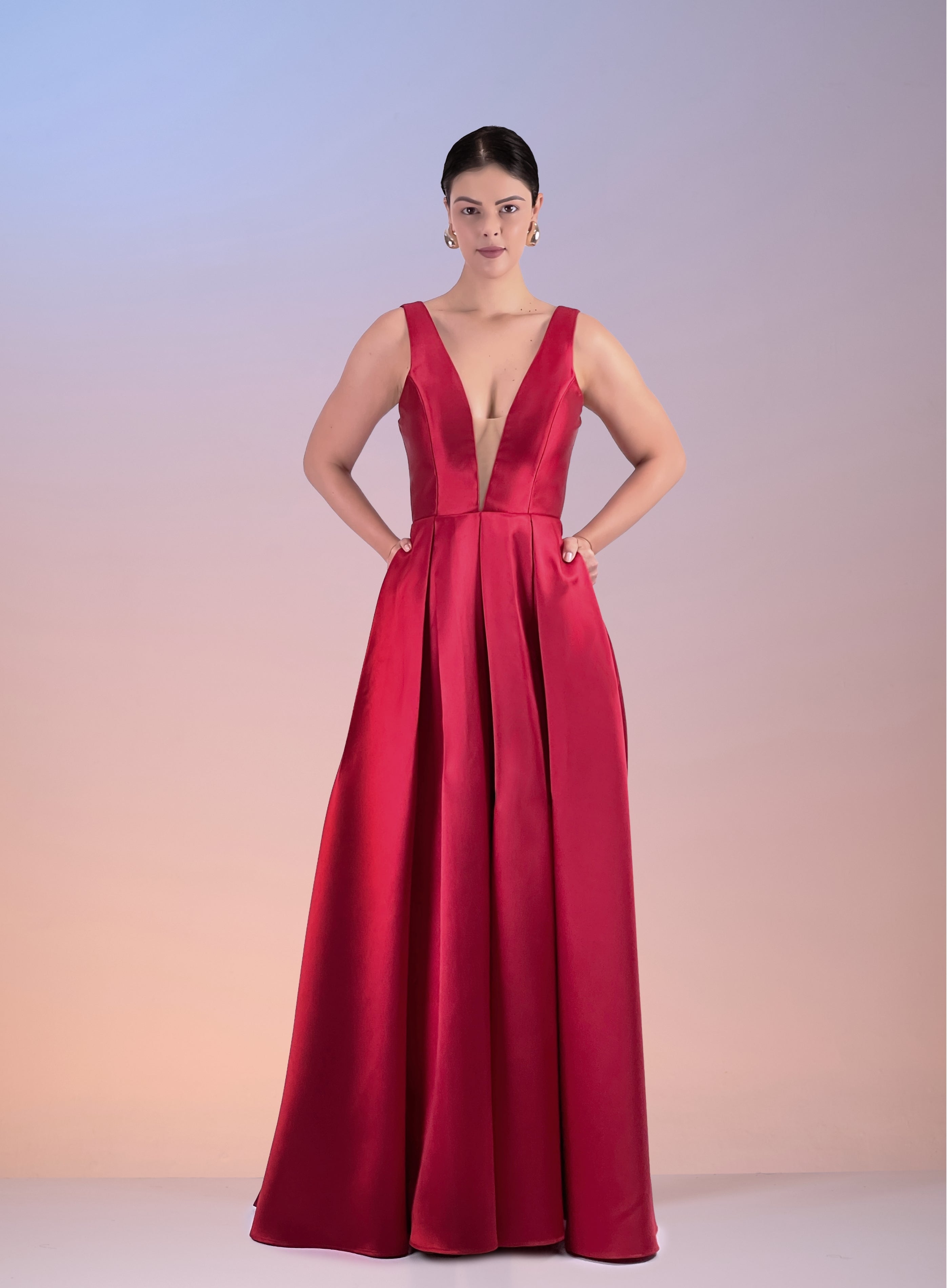 Vestido longo em zibeline silky, com caimento estruturado e acabamento sofisticado. O decote em V profundo na frente e nas costas valoriza a silhueta, enquanto o tule entre o busto e o bojo meia-taça garante conforto e segurança ao vestir. A saia reta alonga a figura e os bolsos laterais funcionais acrescentam praticidade. Possui fechamento em zíper invisível nas costas com colchete, ideal para eventos formais, festas, casamentos e ocasiões especiais.
