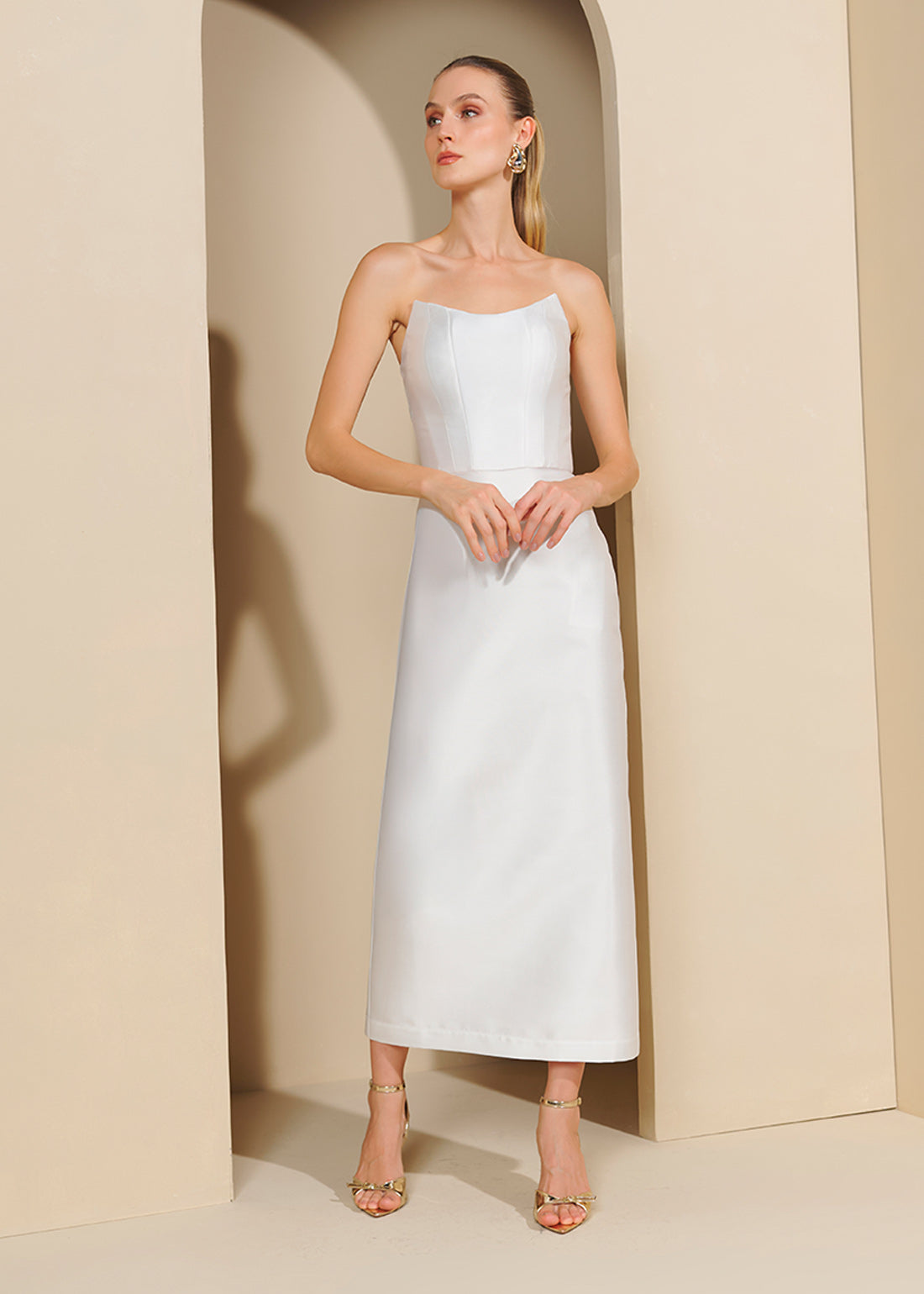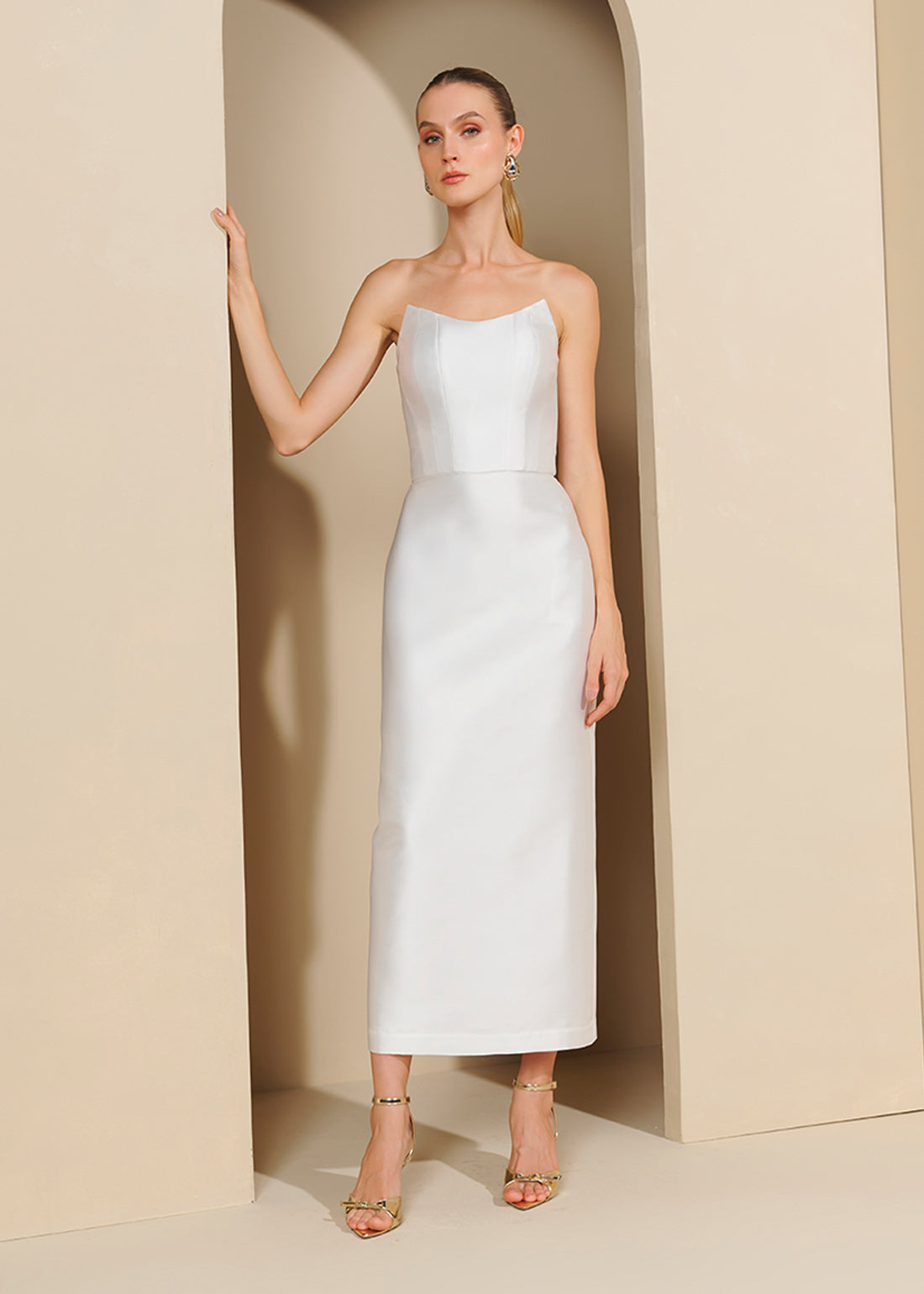 Vestido midi tomara que caia com design sofisticado e caimento estruturado. O bojo meia-taça com barbatanas laterais oferece sustentação e ajuste seguro, enquanto a saia midi ajustada valoriza a silhueta com elegância. Versátil, é ideal para eventos casuais refinados, festas, jantares e ocasiões formais. O fechamento por zíper invisível nas costas com colchete garante acabamento discreto e vestir impecável.