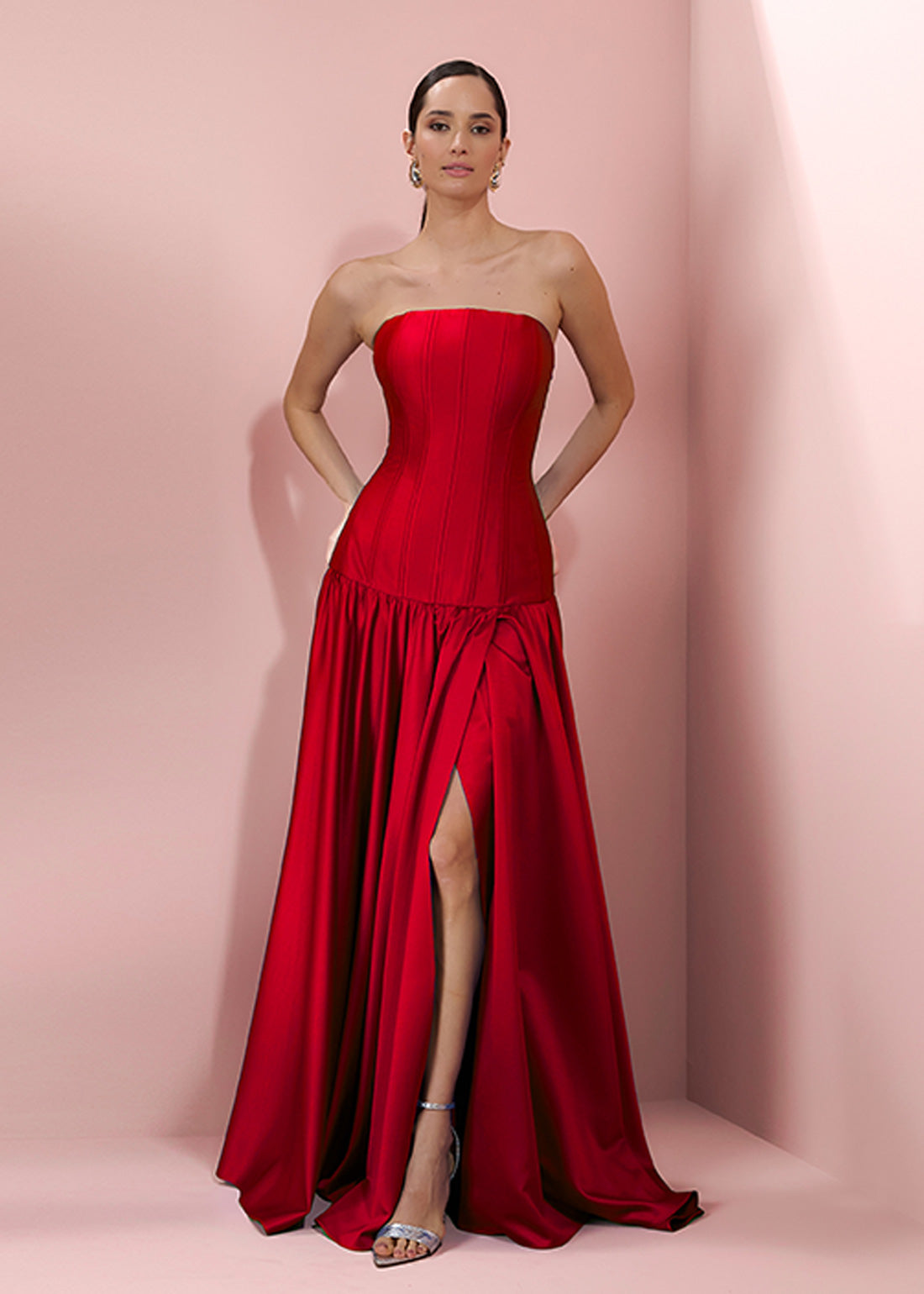 Vestido longo tomara que caia em cdc royale, com modelagem estruturada que valoriza a silhueta. Possui bojo meia-taça, barbatanas e corpinho ajustado até o quadril, garantindo sustentação, conforto e caimento elegante. A saia fluida com fenda lateral adiciona movimento e sofisticação ao visual. O fechamento em rolotê cruzado nas costas forma um X delicado. Ideal para eventos formais, festas, casamentos, formaturas e ocasiões especiais.
