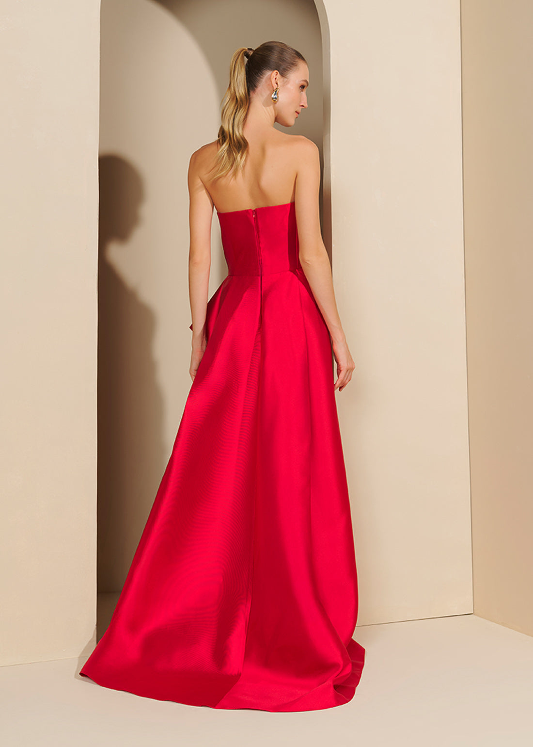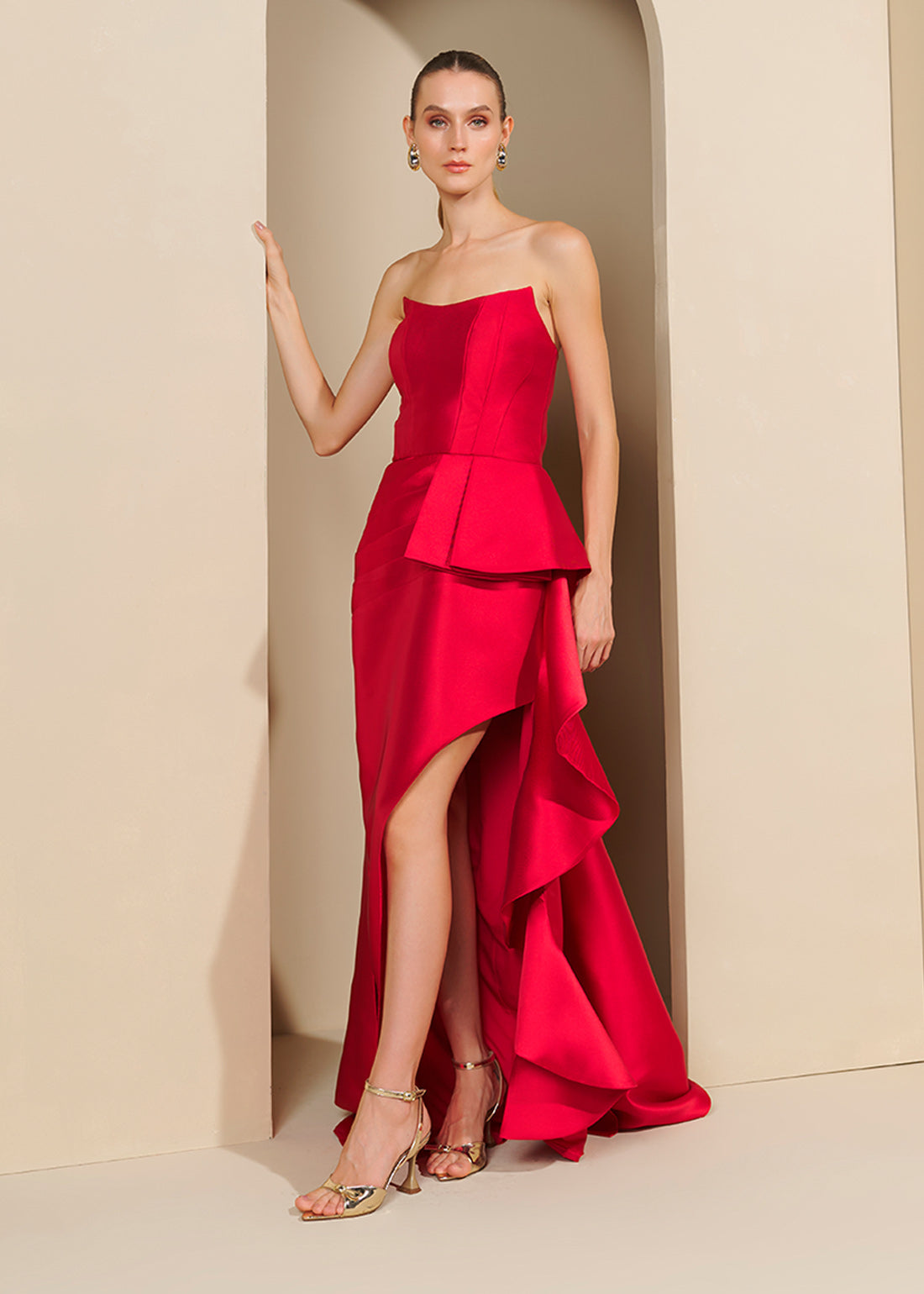 Vestido longo tomara que caia em zibeline, indicado para eventos formais e ocasiões especiais. O busto estruturado com bojo meia-taça e barbatanas laterais garante sustentação e caimento impecável. A saia ajustada ao corpo é valorizada pelo peplum na cintura, enquanto a fenda lateral com sobreposição em jabô traz movimento e sofisticação. Possui fechamento por zíper invisível nas costas com colchete e acabamento refinado. Ideal para festas, casamentos, formaturas e eventos noturnos elegantes.