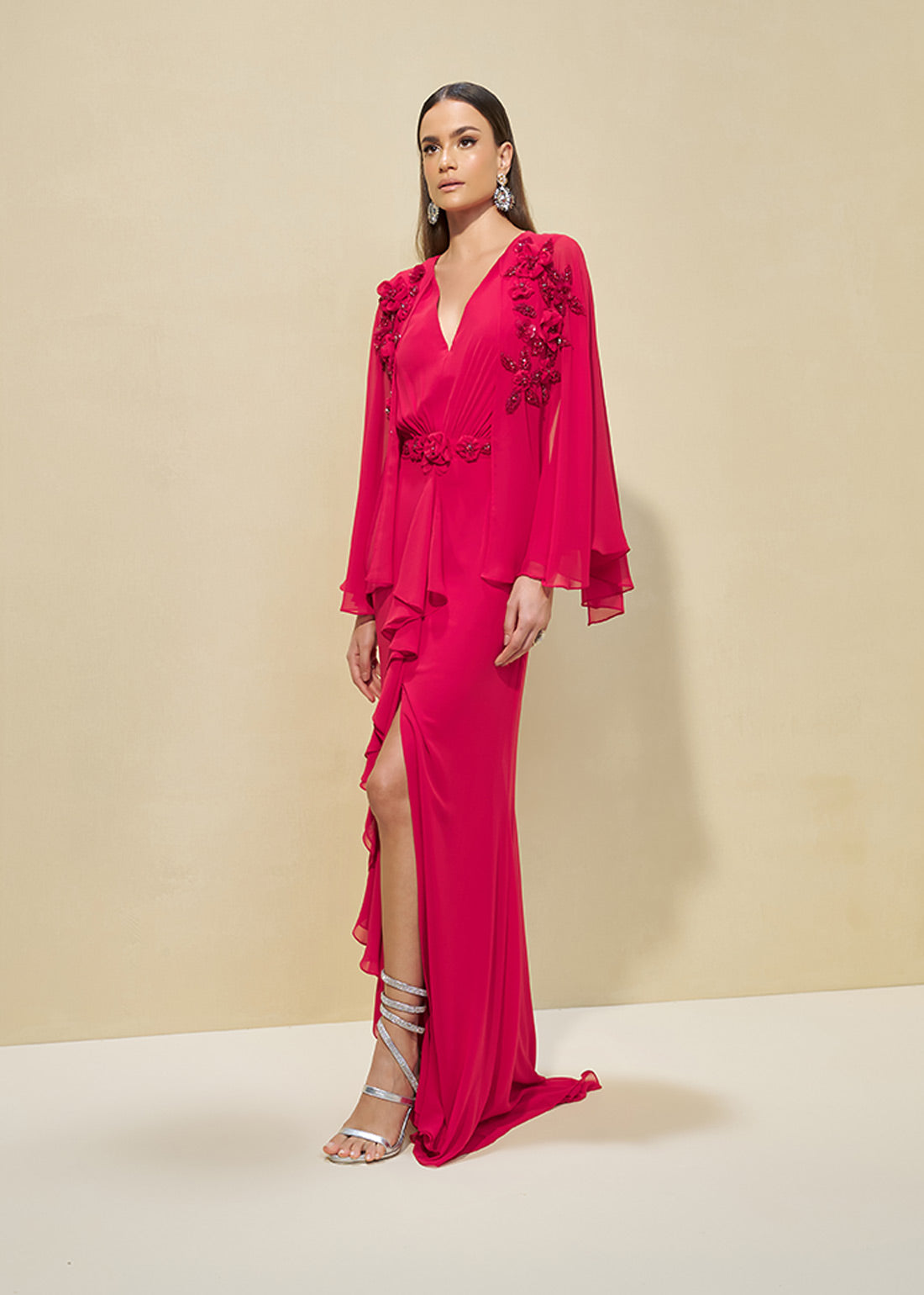 Vestido confeccionado em tecido chiffon saab. Essa peça possui mangas amplas e fluídas, bojo meia taça, decote em V, corpinho com pregas, barbatanas que estruturam e dão sustentação, detalhe em aplicações florais. Saia reta adornada por jabôs, fenda lateral e zíper invisível fecho costas com colchete. // Composição: 100%Poliéster - Forro 97%Poliéster 03%Elastano // Características do tecido: Toque macio, fluidez e excelente caimento. // Vantagens: Maleável, durável e confortável. // Ideal para casamentos e formaturas. // A tonalidade das cores pode variar de acordo com seu aparelho de celular ou tela do monitor. Os acessórios utilizados na imagem não acompanham a peça.
