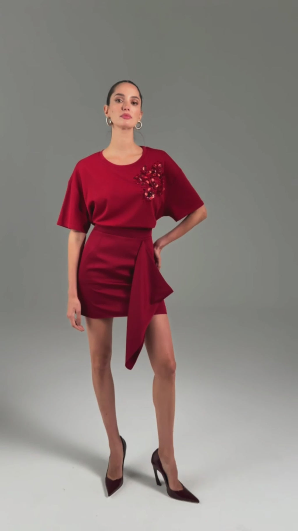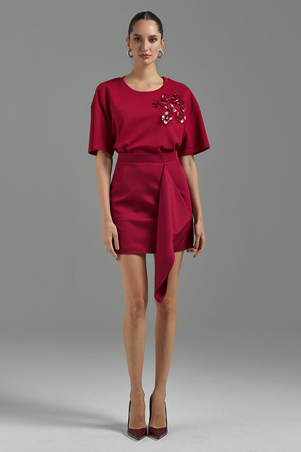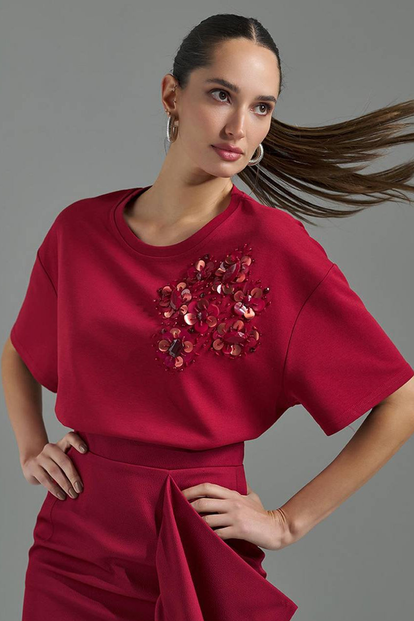 Esta blusa em malha com decote redondo e mangas curtas eleva o conceito de comfort wear ao status de peça de luxo. O destaque fica para o sofisticado bordado manual em paetês, chatons e miçangas, que confere um brilho exclusivo e atemporal. Com caimento impecável e extrema versatilidade, é a escolha ideal para transitar entre eventos casuais, jantares informais ou ocasiões formais que exigem um toque de modernidade e elegância.