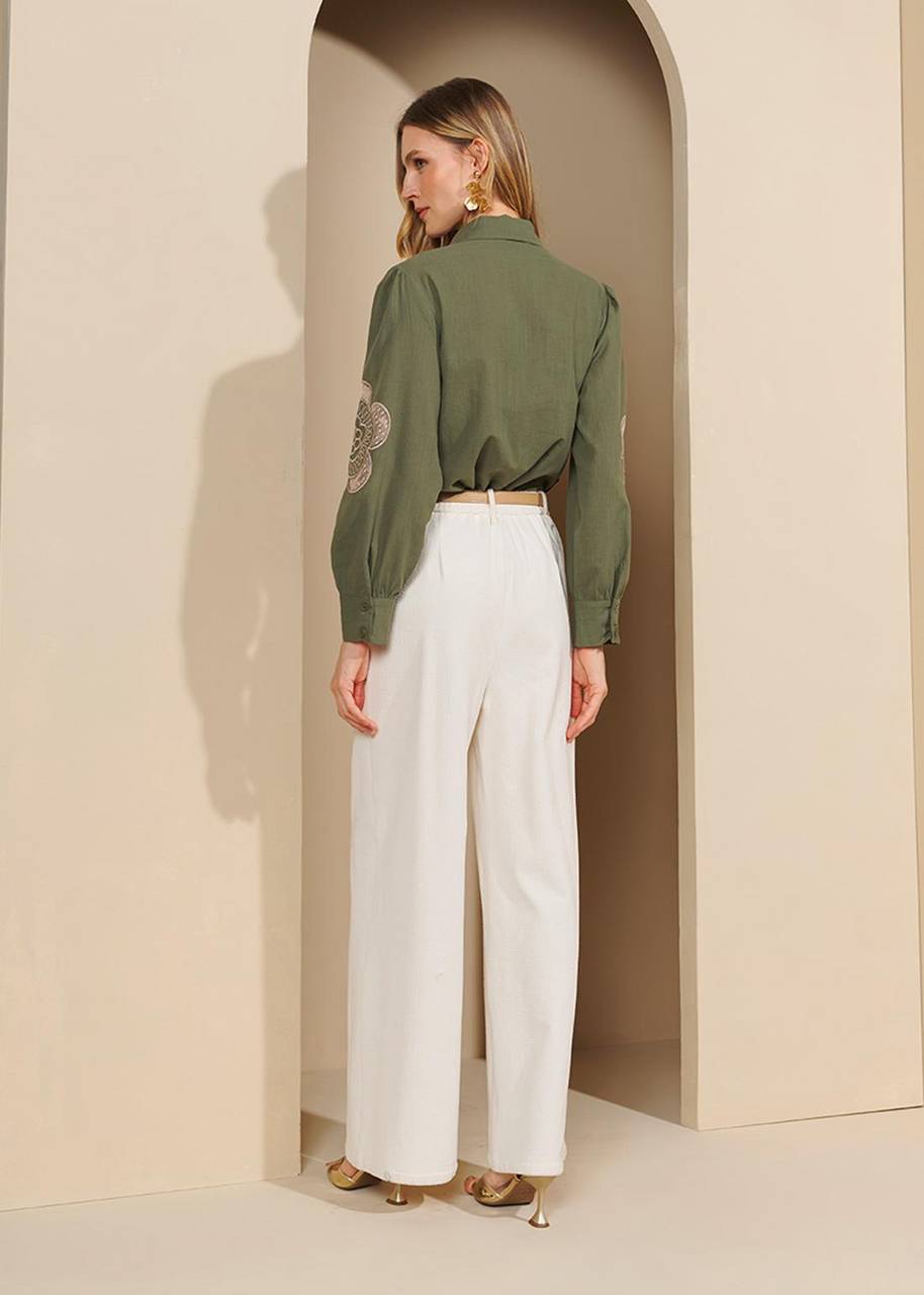 Camisa feminina em tricoline bordado, com design clássico e acabamento sofisticado. Possui gola tradicional, mangas longas com abotoamento no punho e fechamento frontal por botões, oferecendo caimento elegante e confortável. Os bordados agregam textura e valor à peça, tornando-a versátil para composições casuais, informais e produções mais alinhadas para o trabalho ou eventos diurnos.