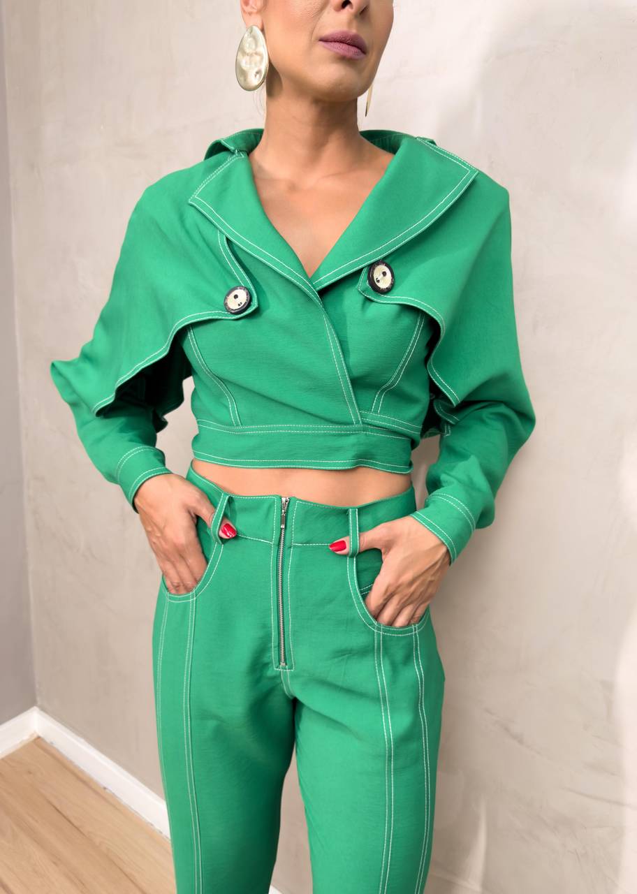 Conjunto feminino em alfaiataria com acabamento pespontado e design sofisticado. O casaco cropped possui meia gola, lapela estruturada, ombreiras e mangas longas com abotoamento, além de recorte sobreposto com botão frontal. A cintura conta com colchete interno e faixa para amarração, valorizando o caimento. A calça reta tem zíper aparente, passantes na cintura e bolsos frontais funcionais. Uma peça versátil, ideal para ocasiões casuais elegantes, compromissos profissionais e eventos sociais que pedem um visual moderno e alinhado.