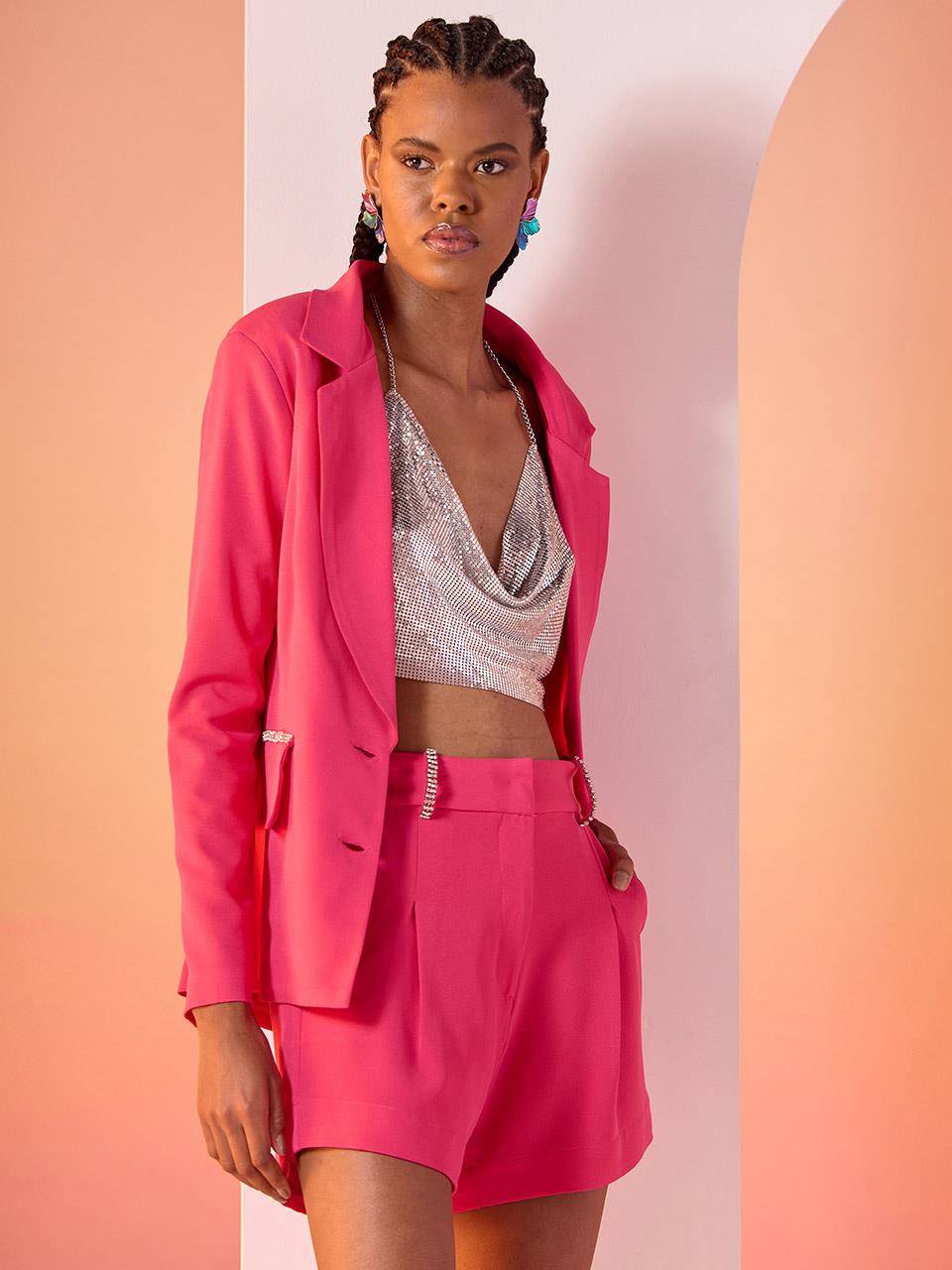 Conjunto confeccionado em tecido crepe composto por: Blazer, possui ombreiras, lapela, mangas longas, bolsos falsos com detalhe em strass, abotoamento frontal e abertura nas costas com strass. Short modelo mais soltinho, possui bolsos laterais funcionais, passantes com detalhe em strass, colchetes e zíper invisível para fecho frontal. // Composição: 97%Poliéster 03%Elastano - Forro 100%Poliéster // Características do tecido: