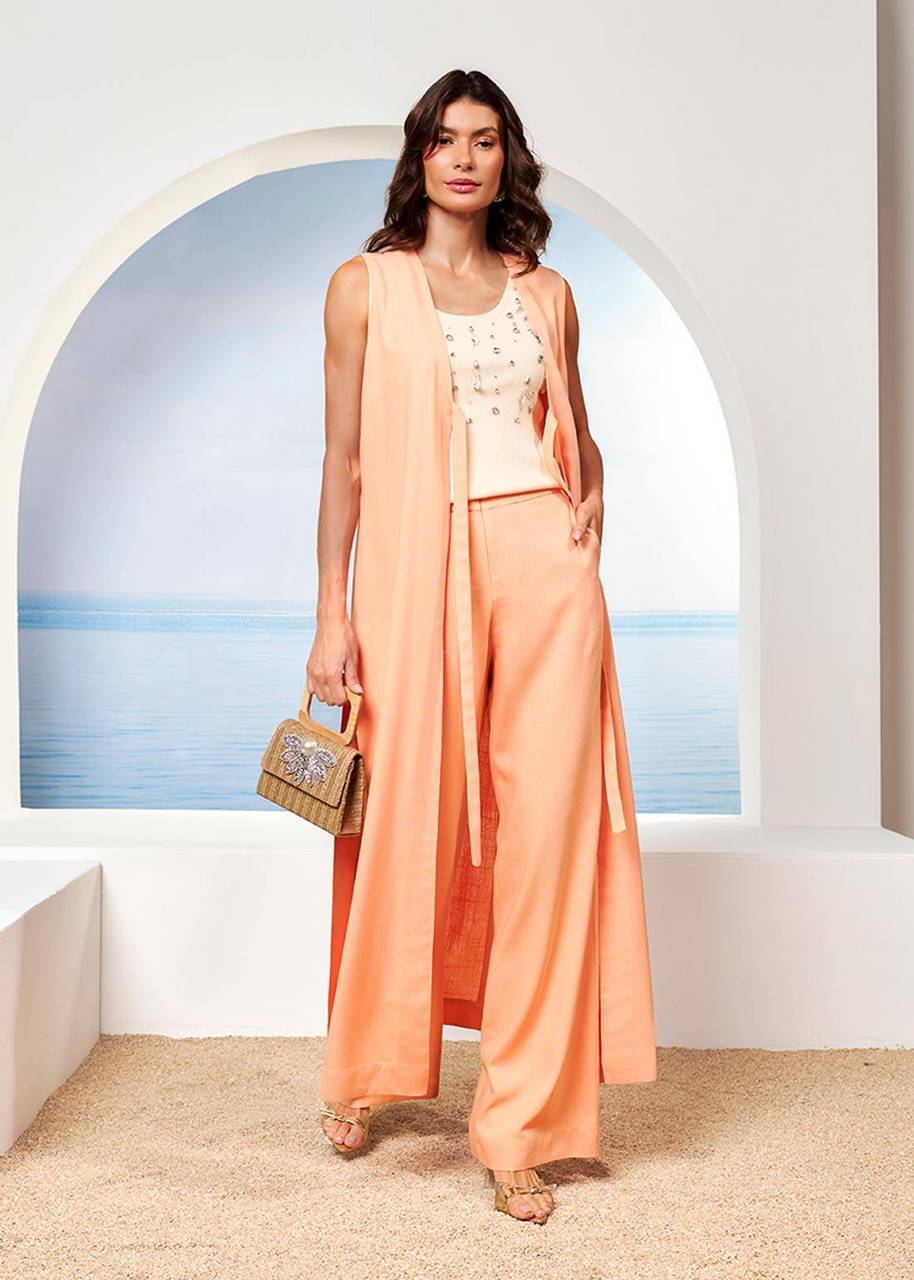 Conjunto feminino em tecido Kalix, composto por max colete com decote profundo em V e fechamento por amarração frontal, e calça pantalona de modelagem solta e alongada. Possui bolsos laterais funcionais e zíper invisível, garantindo acabamento discreto. O caimento é fluido e confortável, ideal para eventos casuais elegantes, produções sofisticadas para o dia ou ocasiões especiais.