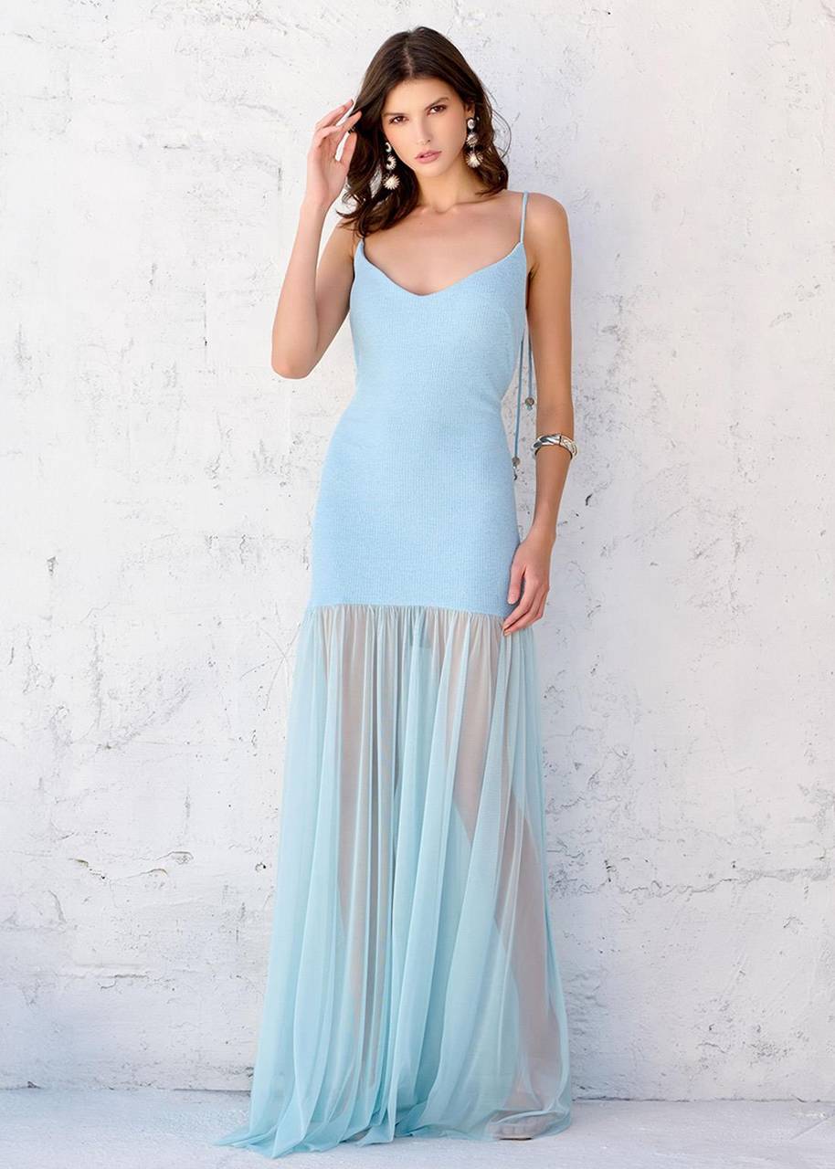 Vestido longo em malha tricot canelada com bojo meia taça e decote em V, que valoriza o colo com elegância. As alças finas com amarração e ponteiras permitem ajuste ideal ao corpo, enquanto a saia longa em tule adiciona leveza, movimento e sofisticação ao visual. Uma peça versátil, perfeita para eventos casuais elegantes, ocasiões informais especiais e produções noturnas.