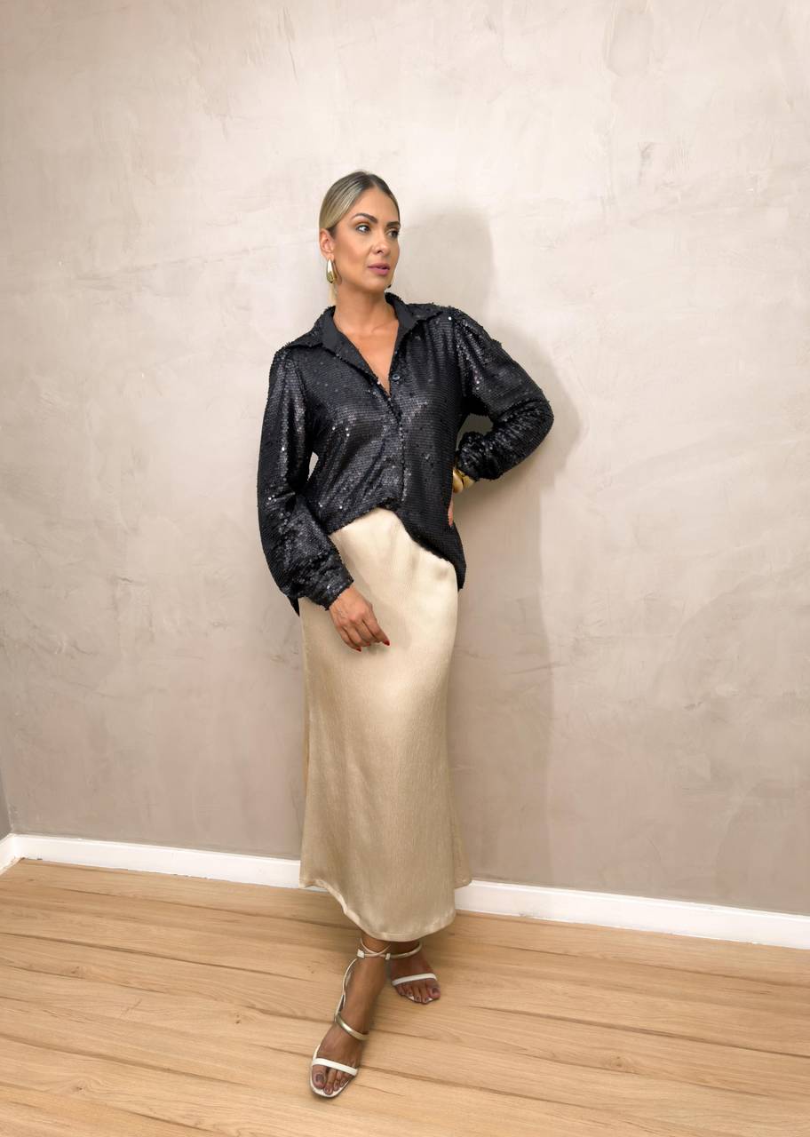Saia midi em cetim, com acabamento sofisticado e caimento elegante que valoriza a silhueta. O brilho sutil do tecido traz um visual refinado, ideal para produções casuais elegantes, eventos informais ou composições mais formais. Possui fechamento por zíper invisível nas costas, garantindo discrição e melhor ajuste ao corpo.