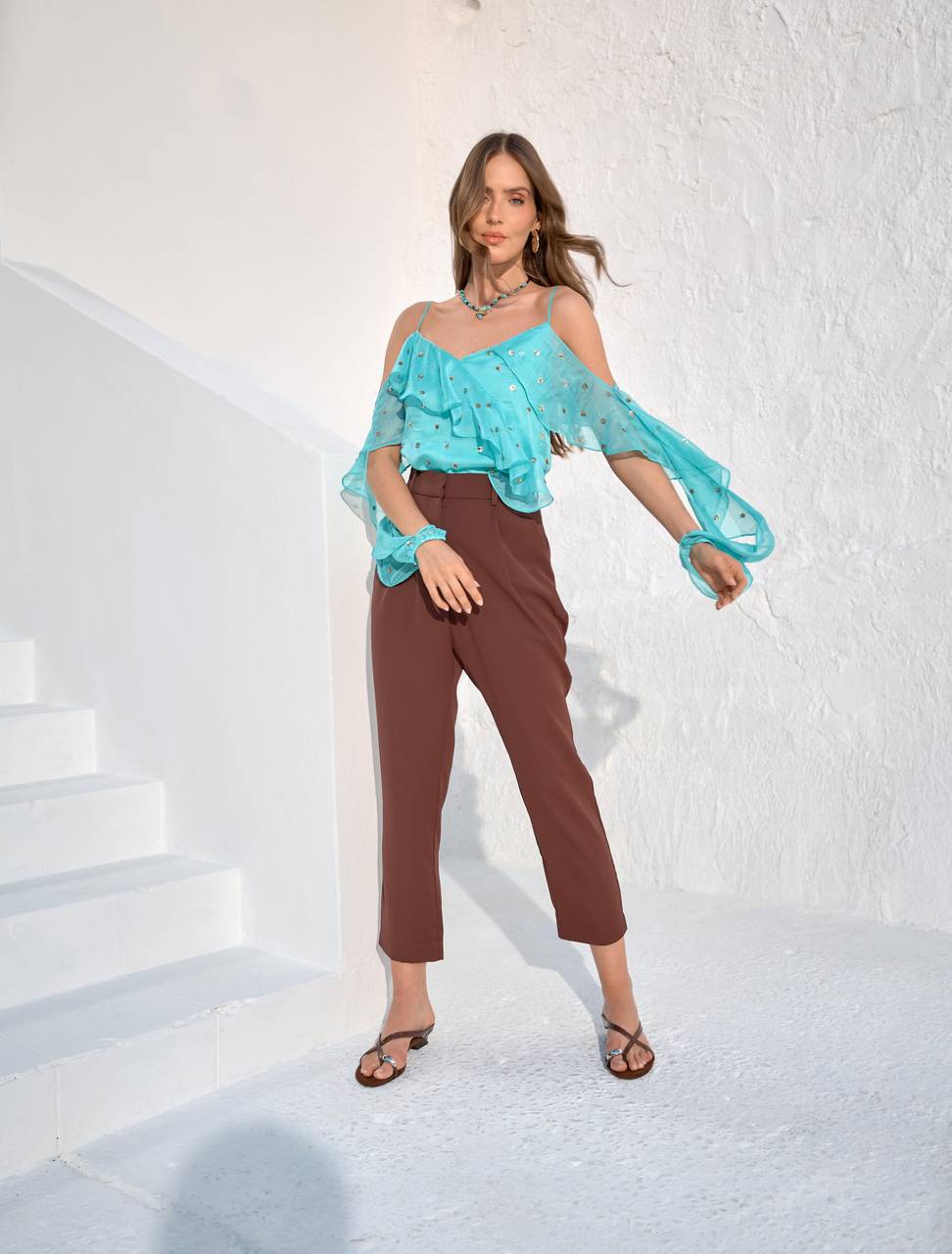 Blusa feminina em chiffon com design delicado e sofisticado. O modelo possui decote em V, babados sobrepostos e recorte ombro a ombro, que valoriza o colo com leveza e feminilidade. As alças finas complementam o visual com elegância, enquanto o caimento fluido garante conforto ao vestir. Versátil, é ideal para composições casuais elegantes, eventos informais e produções refinadas para o dia ou a noite.