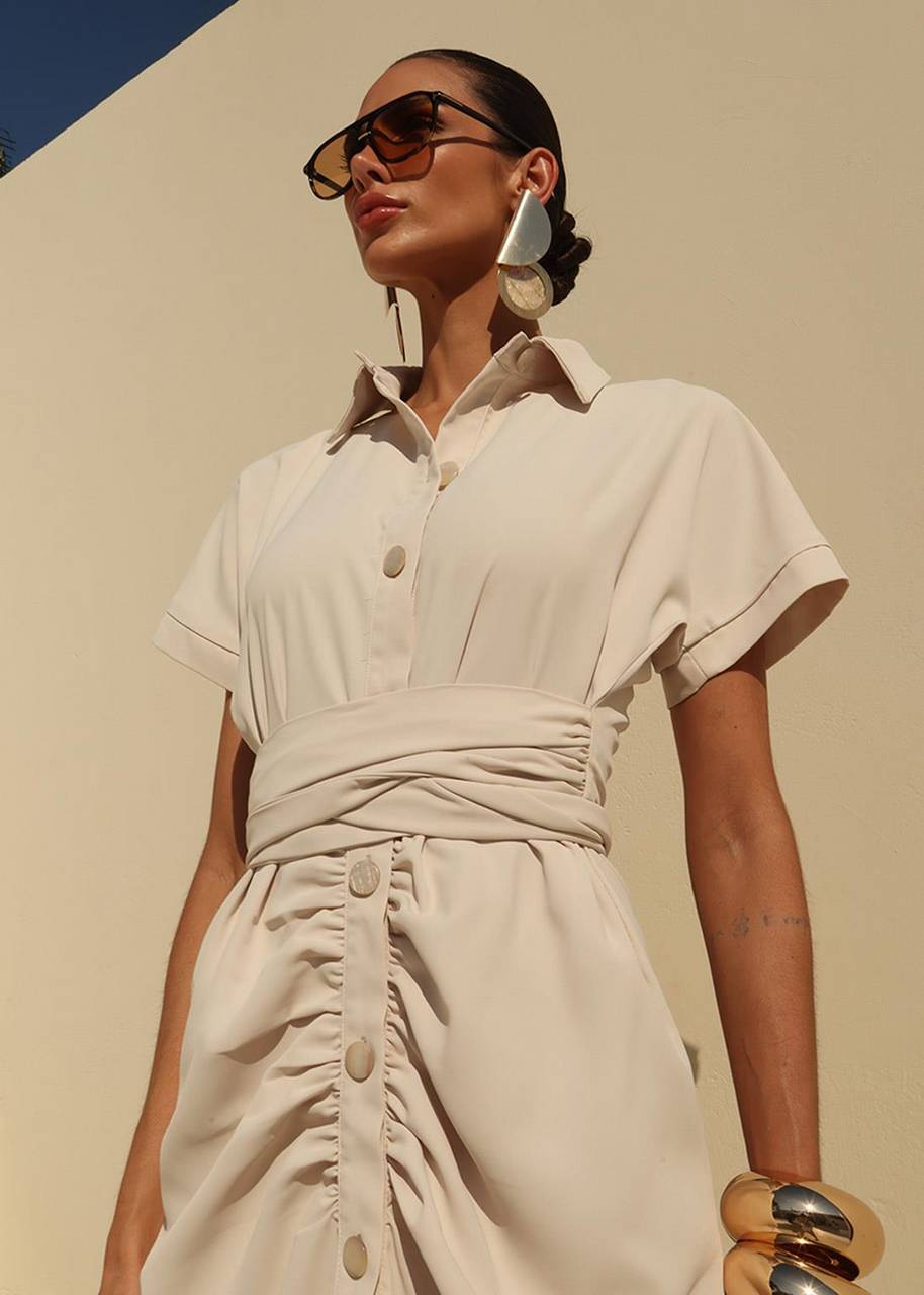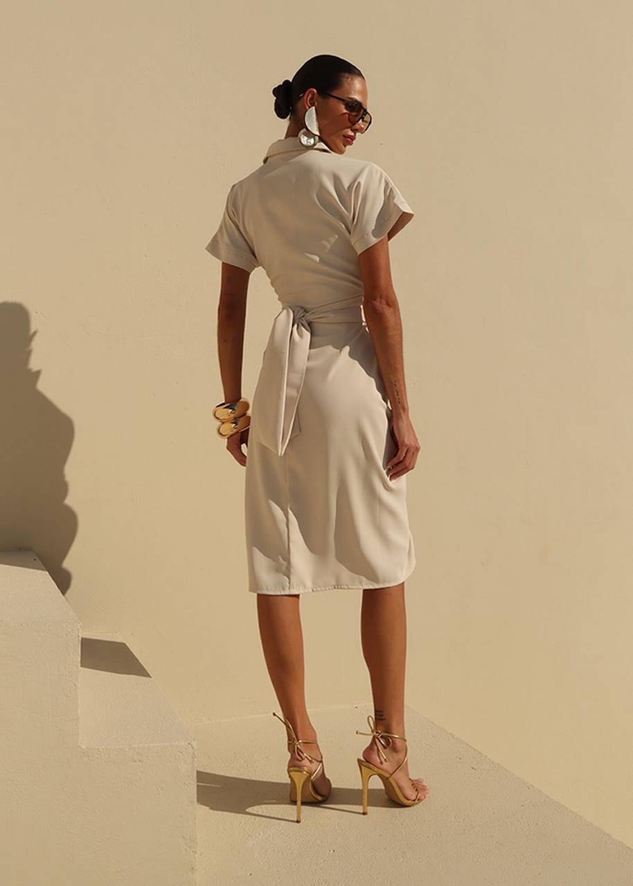 Vestido midi feminino confeccionado em Twill Victoria, com design elegante e atemporal. Possui gola tradicional, mangas curtas e abotoamento frontal, além de sobreposição com amarração na cintura que permite ajuste do caimento e valoriza a silhueta. A fenda frontal discreta traz leveza e sofisticação ao visual. Versátil e confortável, é ideal para eventos casuais e informais, compromissos diurnos, encontros e produções elegantes do dia a dia.