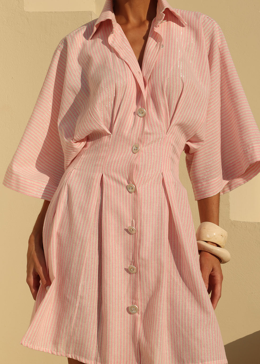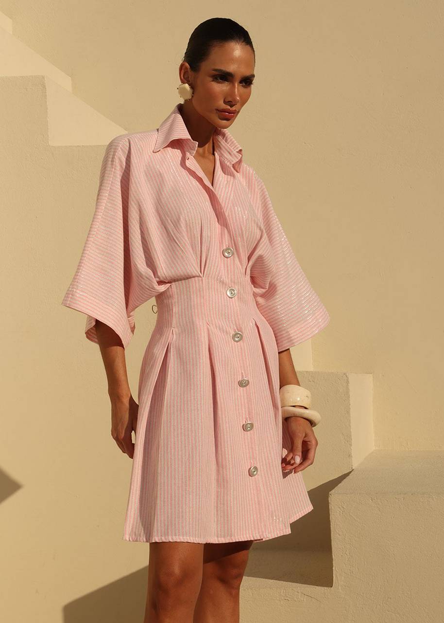 Vestido chemise listrado de estética sofisticada e atemporal, com modelagem cuidadosamente pensada para valorizar a silhueta com leveza. A cintura levemente marcada cria equilíbrio visual e elegância, enquanto a saia com shape evasê garante fluidez e movimento ao caminhar. Os botões frontais funcionais e a gola clássica reforçam o caráter refinado da peça, e as mangas amplas acrescentam conforto e modernidade. Versátil e elegante, transita com facilidade entre ocasiões casuais sofisticadas, eventos diurnos e ambientes de trabalho com dress code leve.
