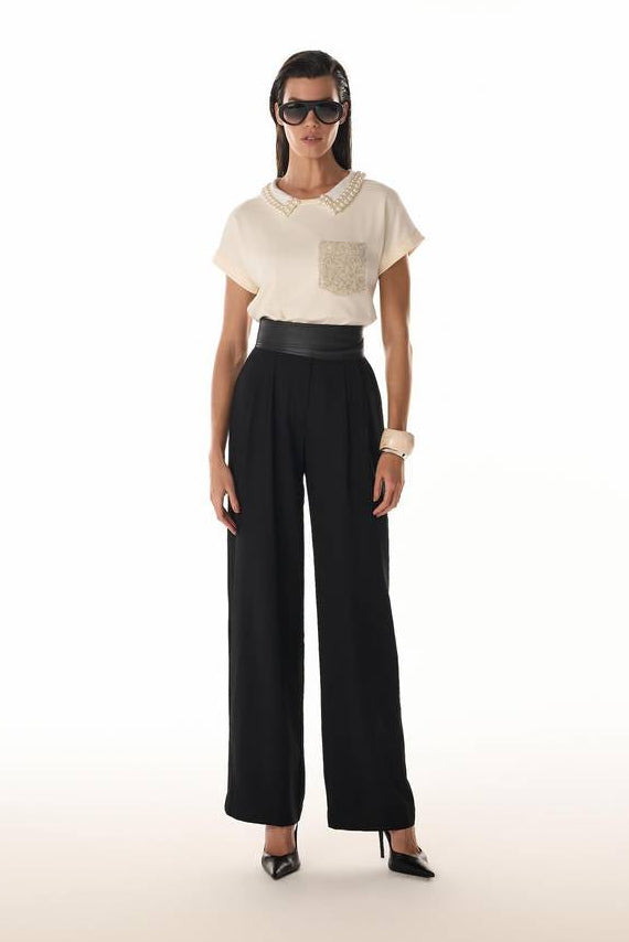 Sofisticada e versátil, esta blusa feminina eleva o seu estilo com um design exclusivo. O modelo apresenta gola clássica com rica aplicação de pérolas e bolso frontal em tecido texturizado, criando um contraste elegante. Com mangas curtas dobradas e caimento soltinho, a peça veste com fluidez e naturalidade. É a escolha perfeita para compor looks casuais chiques ou transitar com elegância em eventos informais que exigem um toque de luxo.