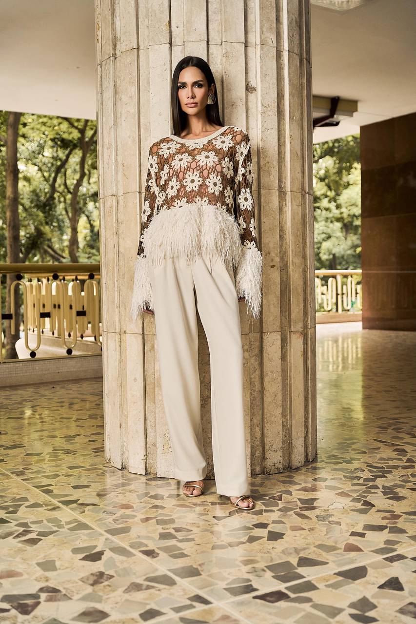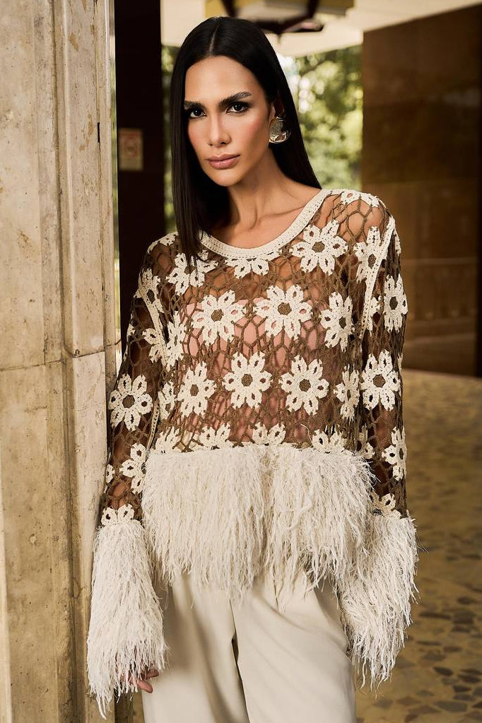 Blusa feminina em crochê floral com design sofisticado e acabamento artesanal. As mangas longas com aplicação de plumas em lurex nos punhos e na barra adicionam elegância e movimento à peça. Possui toque macio, caimento leve e confortável, com excelente maleabilidade. Versátil, é ideal para eventos formais e informais, compondo produções elegantes para ocasiões especiais ou compromissos sociais. Recomenda-se ajuste de costura para caimento perfeito.