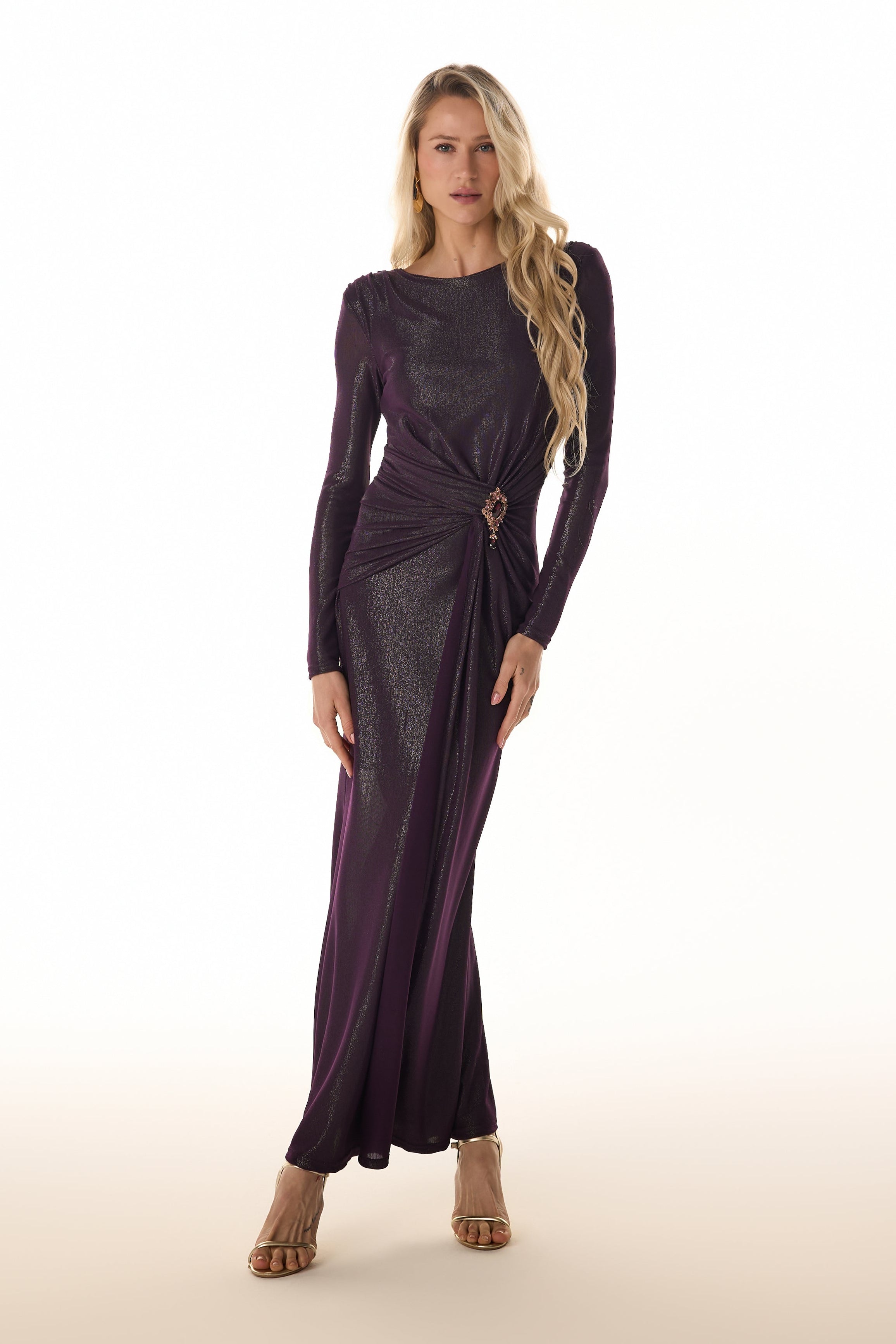 Este vestido longo em malha lurex é a escolha definitiva para eventos formais, galas e festas sofisticadas. Com mangas longas e ombreiras estruturadas por delicados franzidos, a peça valoriza a silhueta com elegância. O design se destaca pelo drapeado estratégico na cintura e o detalhe em enrosco frontal com broche, que conferem um caimento impecável e luxuoso. Une o brilho sutil à durabilidade e ao extremo conforto, adaptando-se perfeitamente ao corpo com movimento e sofisticação.
