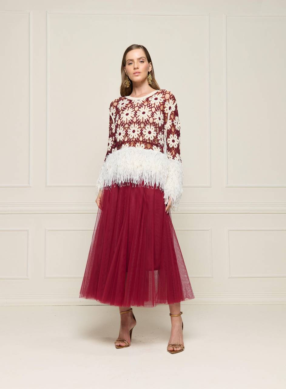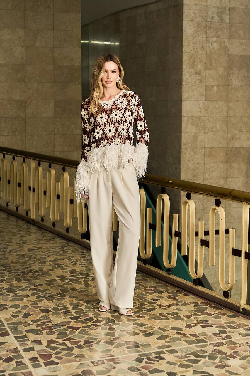 Blusa feminina em crochê floral com design sofisticado e acabamento artesanal. As mangas longas com aplicação de plumas em lurex nos punhos e na barra adicionam elegância e movimento à peça. Possui toque macio, caimento leve e confortável, com excelente maleabilidade. Versátil, é ideal para eventos formais e informais, compondo produções elegantes para ocasiões especiais ou compromissos sociais. Recomenda-se ajuste de costura para caimento perfeito.