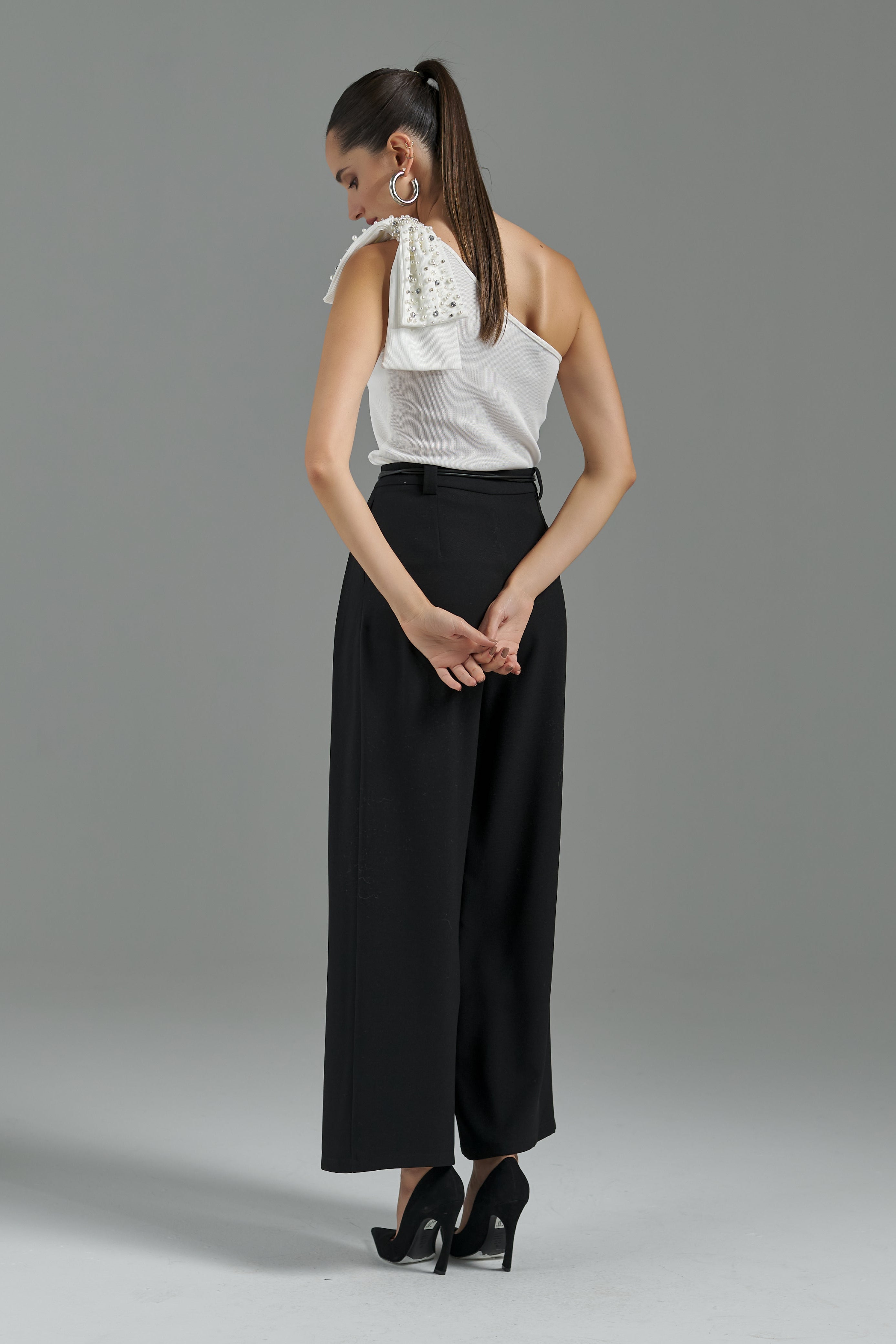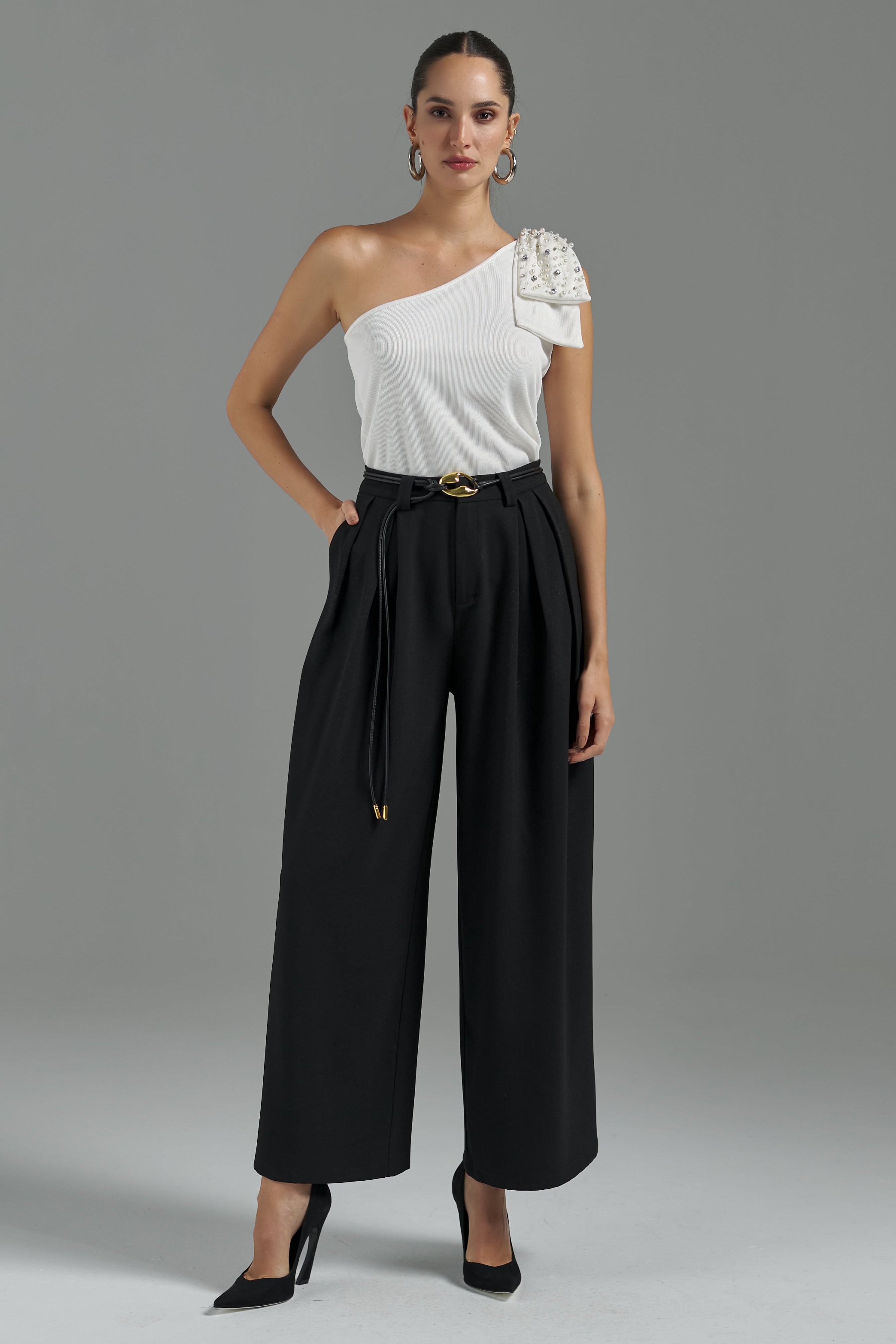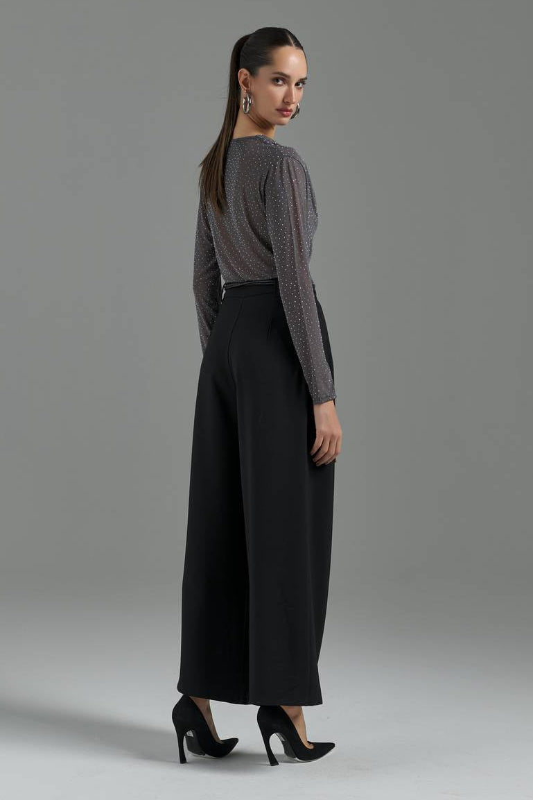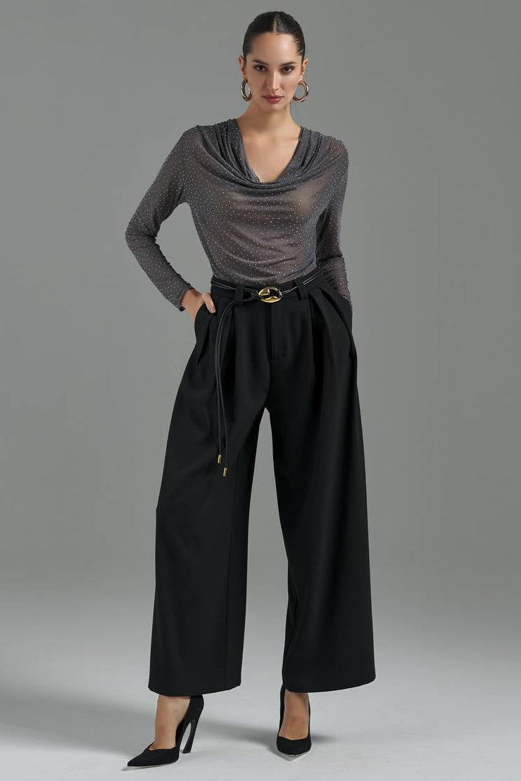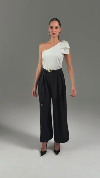 Com modelagem solta e alongada, esta calça em alfaiataria é o equilíbrio perfeito entre elegância e conforto. O design conta com bolsos funcionais, passantes no cós e fechamento em colchetes e zíper, garantindo um visual minimalista e luxuoso. Sua versatilidade permite transitar com maestria entre eventos formais e ocasiões casuais, adaptando-se a diferentes estilos com sofisticação e caimento impecável.